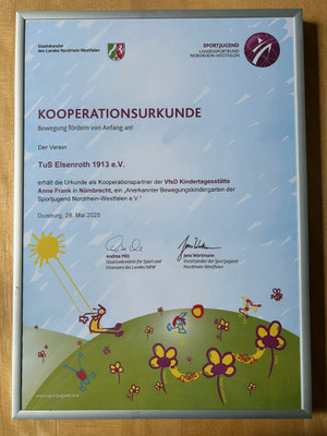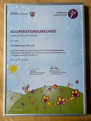 Im Rahmen einer kleinen Kita-Feier wurde am 28. Mai die Kooperations-Urkunden an die Kita und den TuS Elsenroth durch Dr. Julius Beucher im Beisein von Vertretern des KSB übergeben.